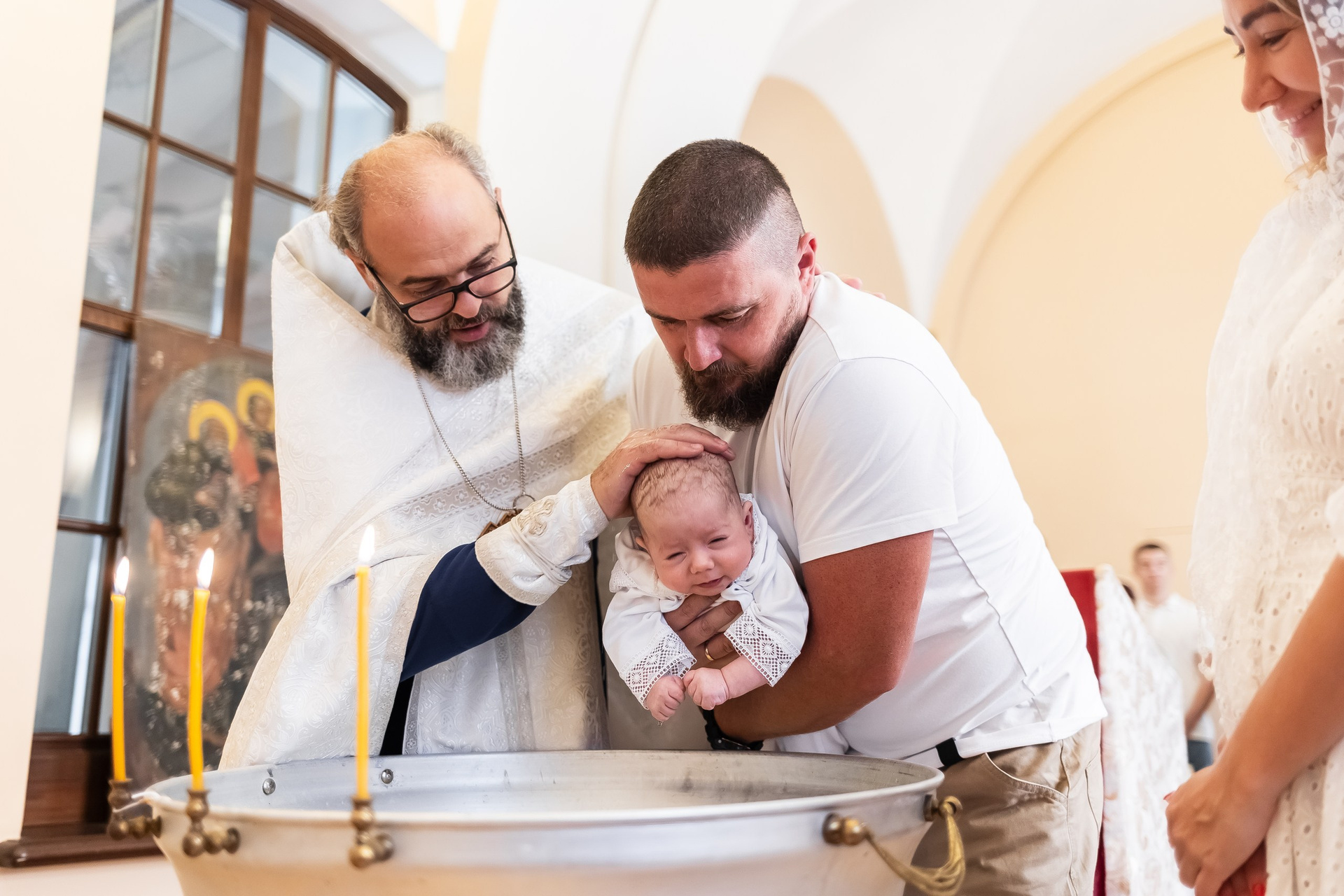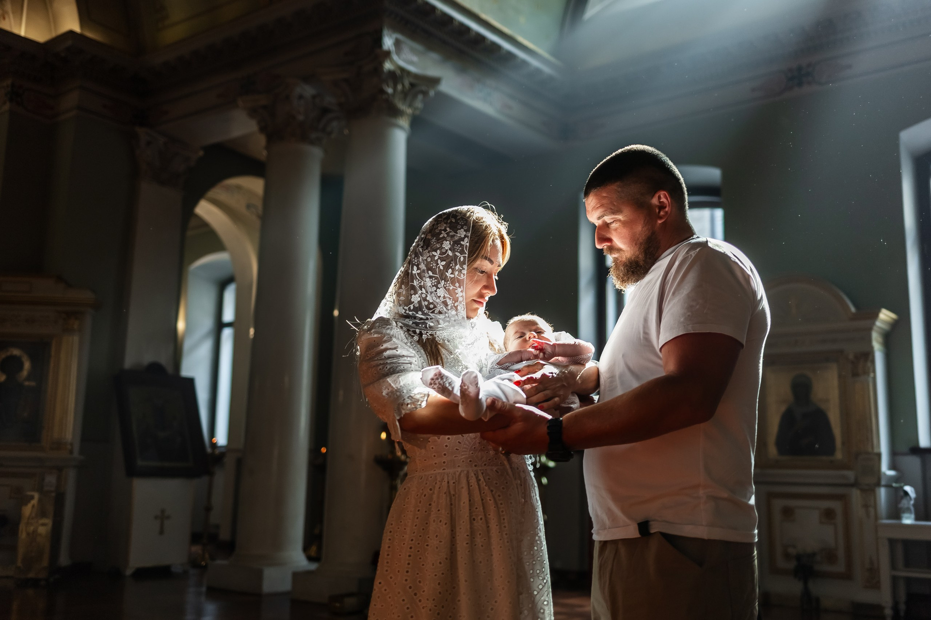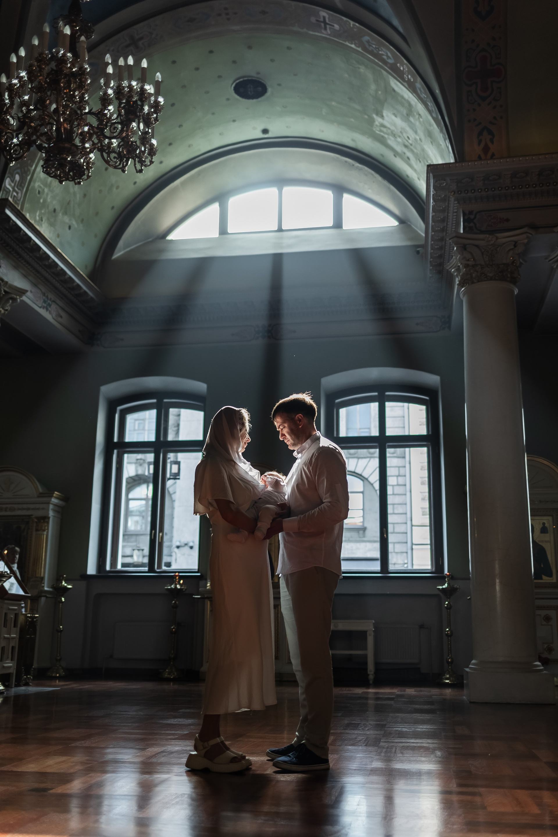 Во время самой церемонии я двигаюсь осторожно, выбирая удачные ракурсы и естественный свет, чтобы не нарушать ход богослужения. В конце, если храм позволяет, можно сделать общее фото всей семьи у иконостаса, а также отдельные портреты родителей и крестных с ребёнком.