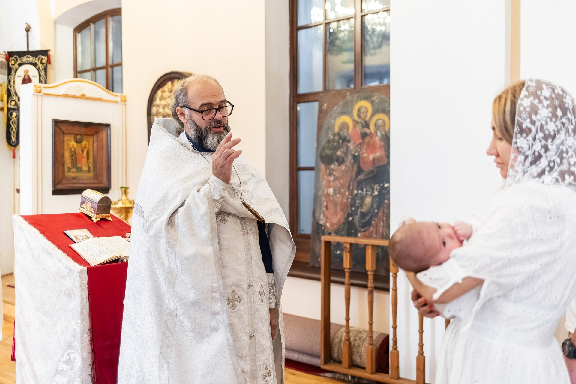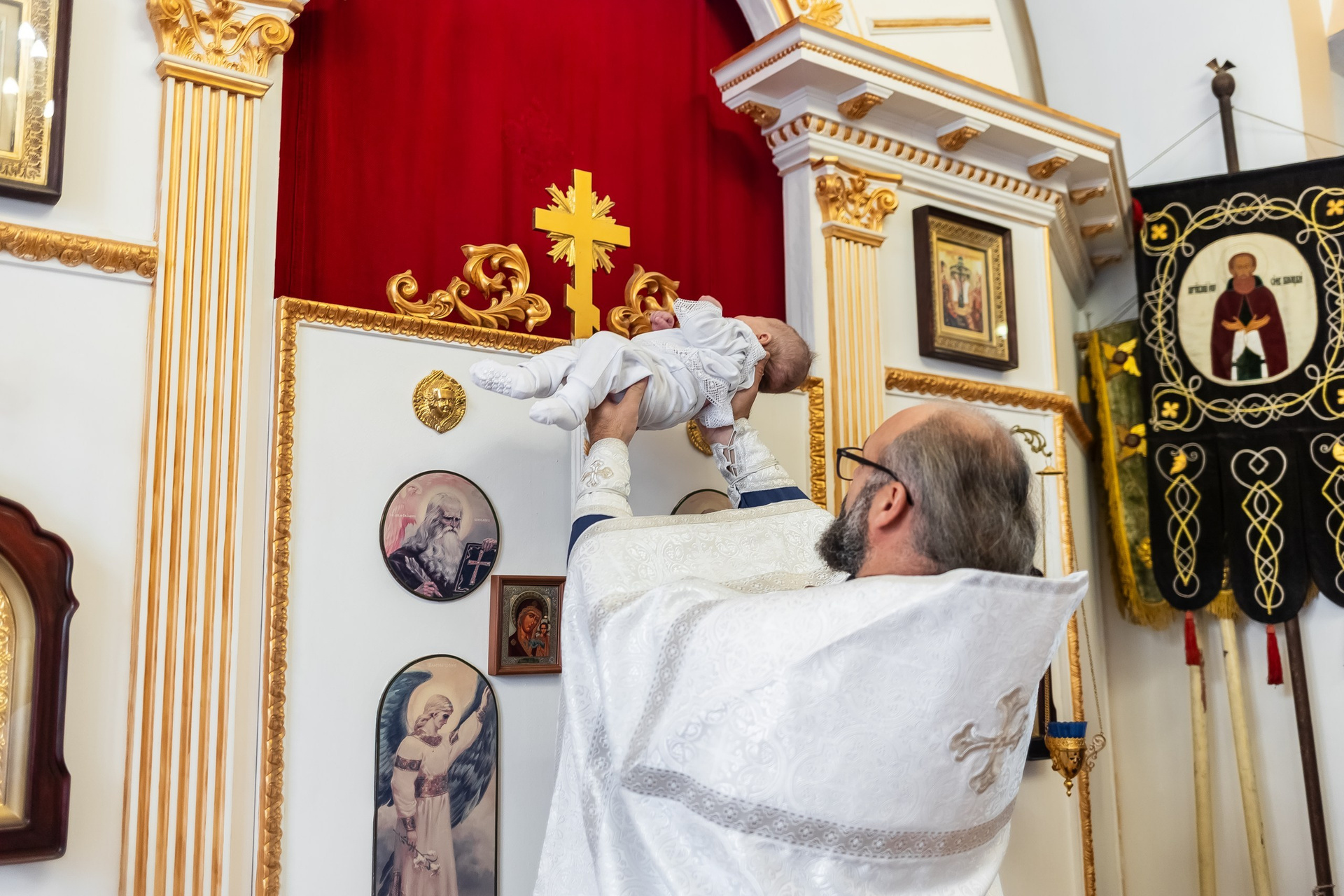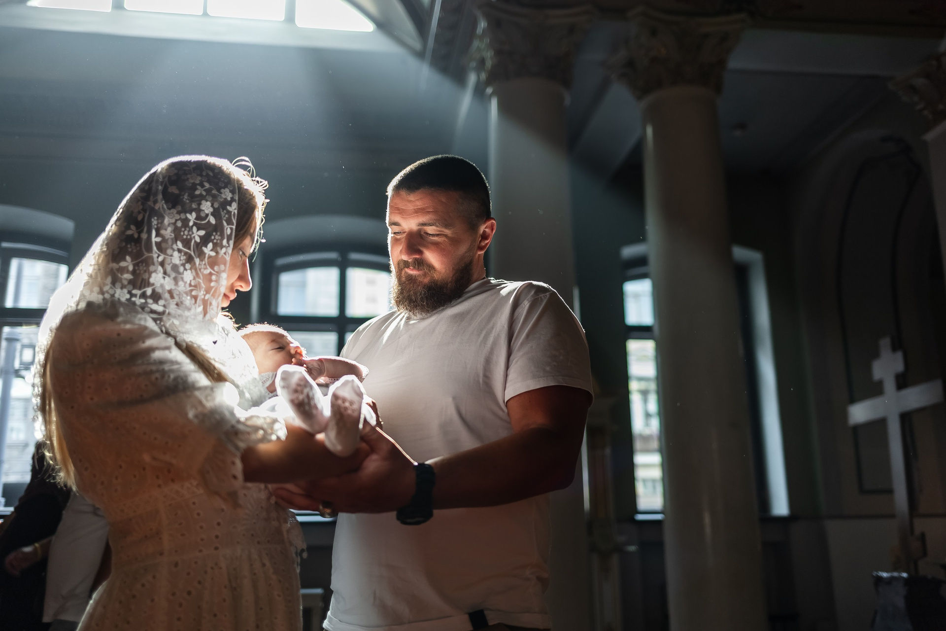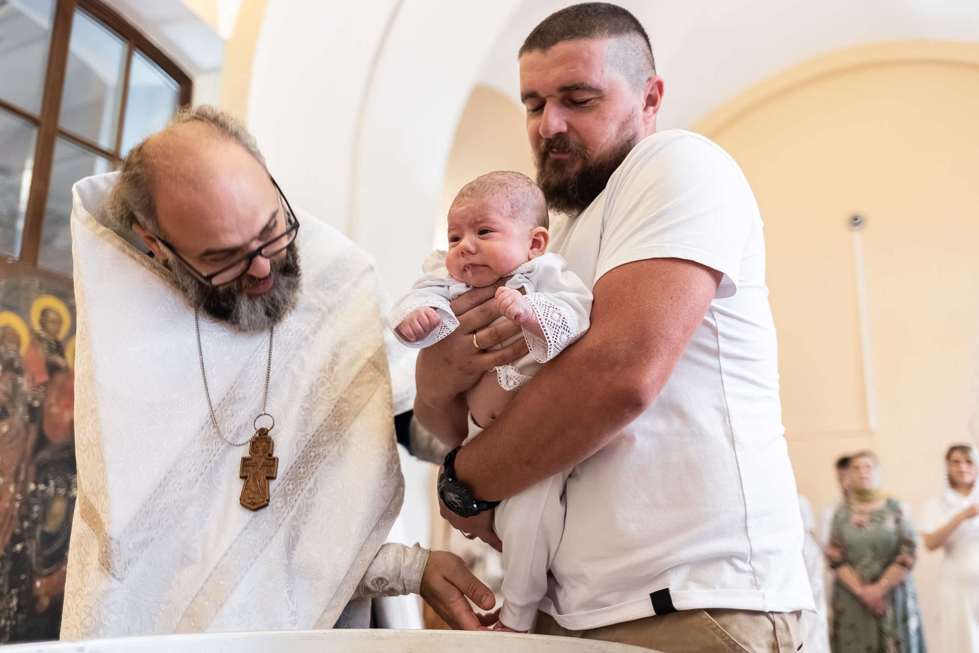 Во время самой церемонии я двигаюсь осторожно, выбирая удачные ракурсы и естественный свет, чтобы не нарушать ход богослужения. В конце, если храм позволяет, можно сделать общее фото всей семьи у иконостаса, а также отдельные портреты родителей и крестных с ребёнком.
