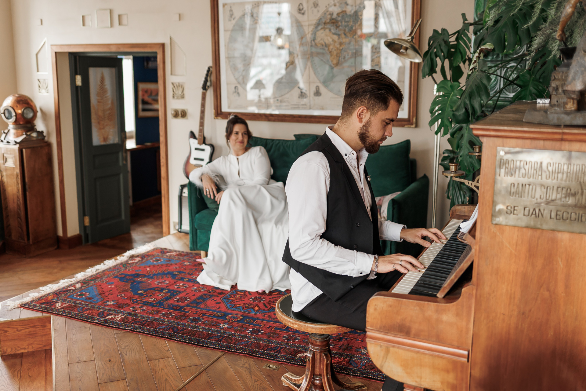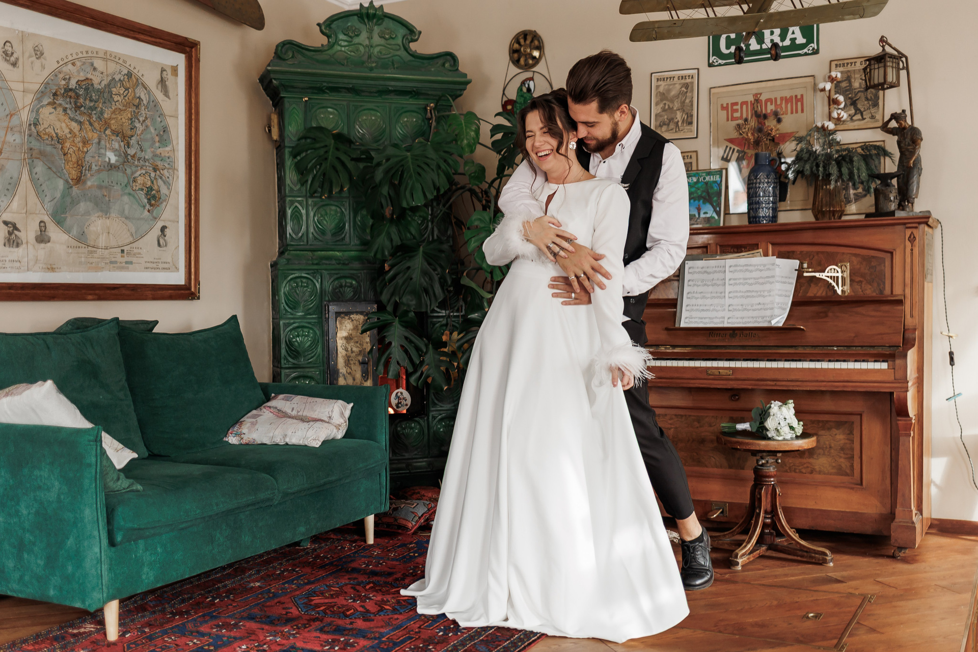 Атмосферная студия с несколькими зонами и дизайнерскими деталями. Подходит для творческих свадебных фотосессий, парных портретов и съёмки с интересным фоном.
