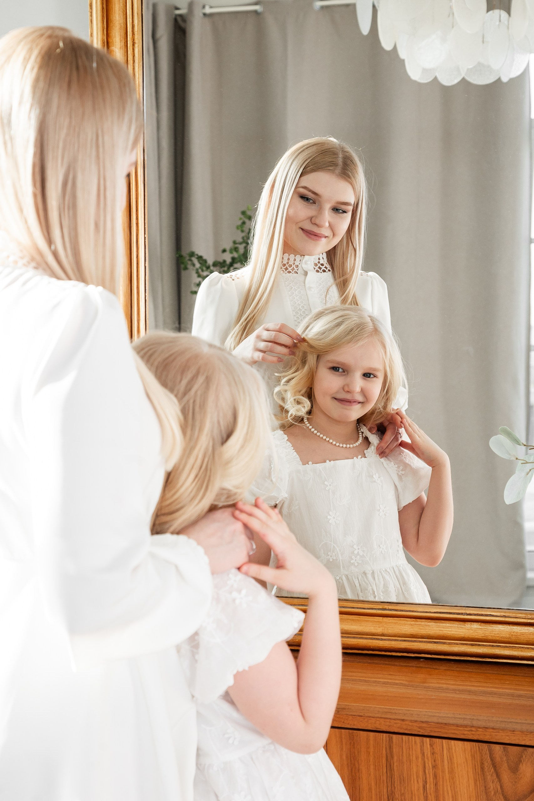 - Устройте общую примерку. Не просто разложите вещи на кровати, а соберите всех и наденьте полные образы. Посмотрите в полный рост в зеркало, сделайте пробные кадры на телефон. Так вы сразу увидите, все ли гармонично, не «пропадает» ли кто-то, не возникает ли визуального дисбаланса.