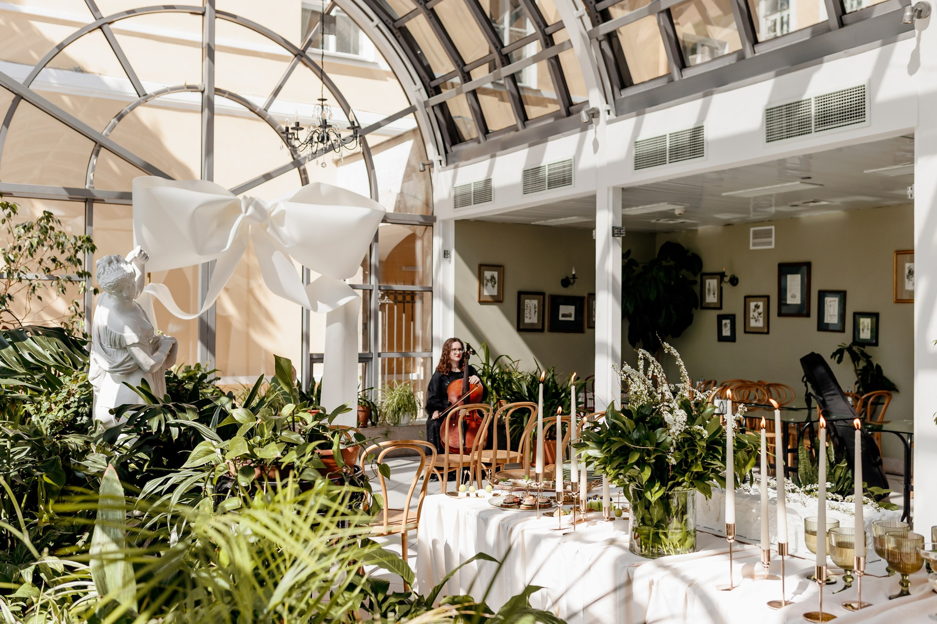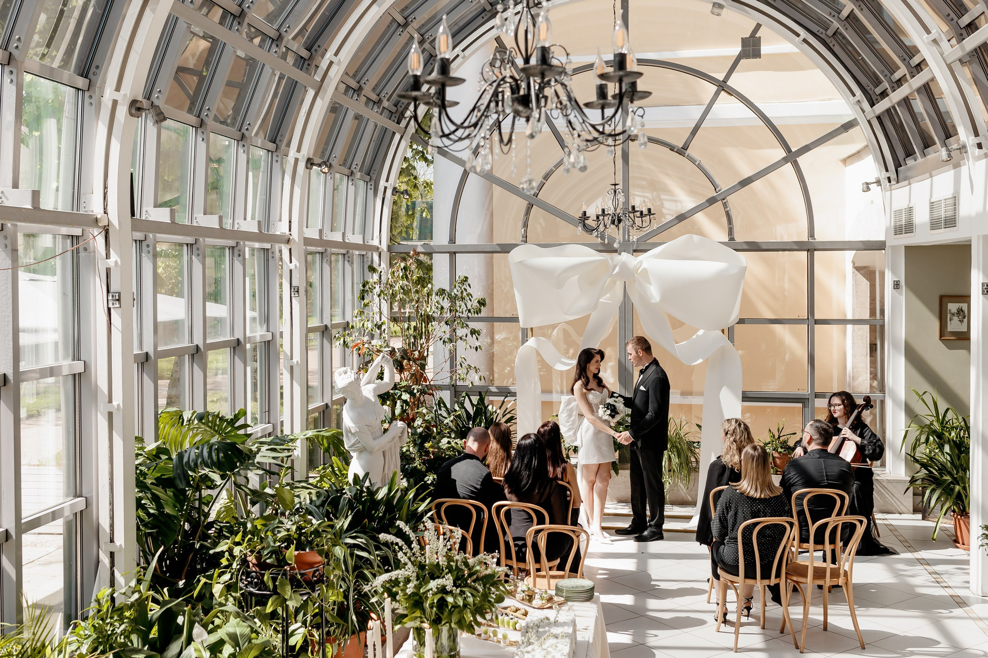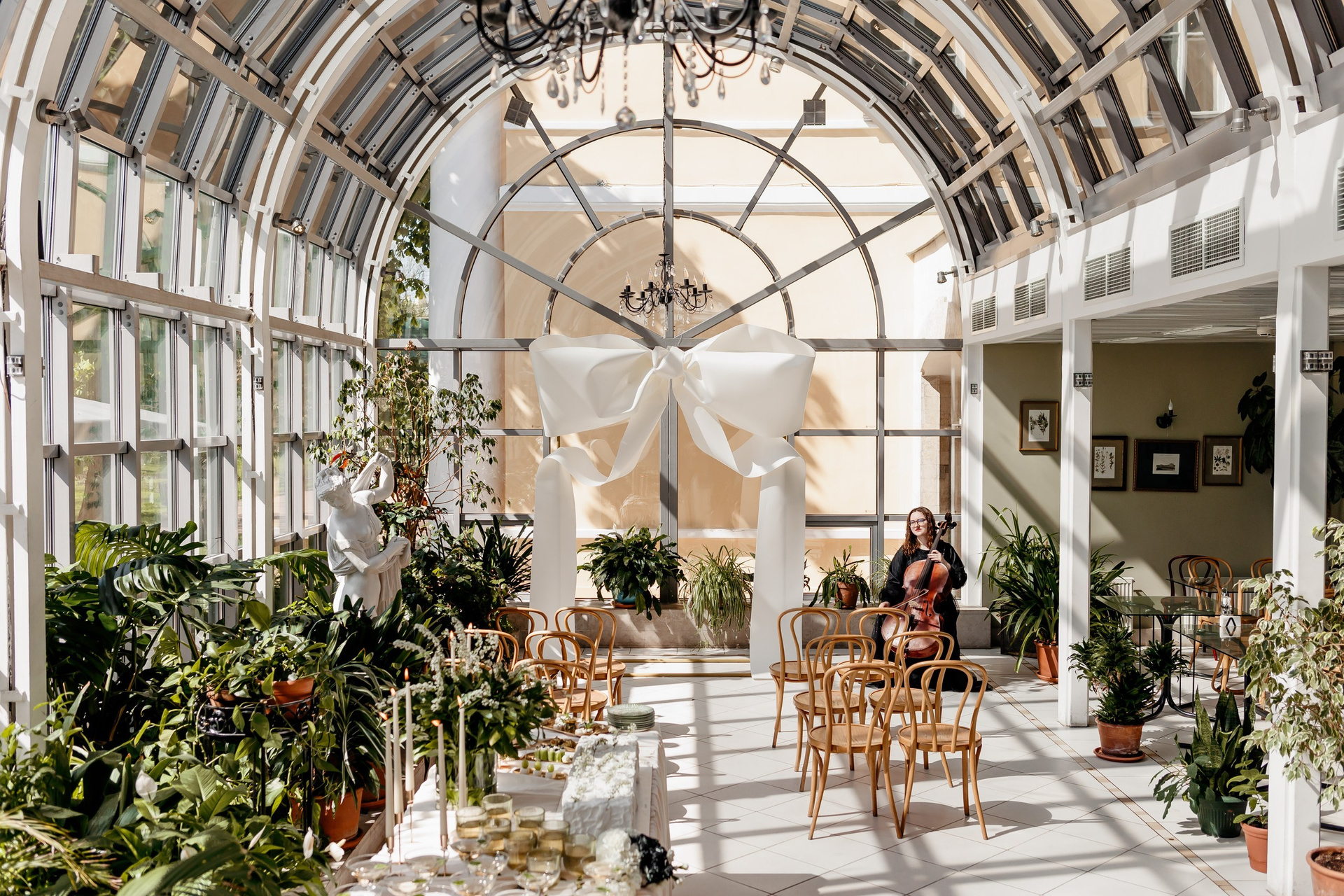 - Спасение от капризов погоды. В «Оранжерее» всегда тепло и сухо (+20…+25°C), даже если за окном промозглый ноябрьский дождь. Это идеальный вариант для осенних, зимних и ранневесенних свадеб.